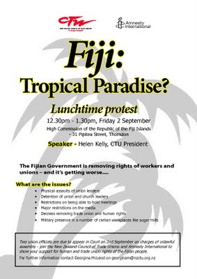 The Welllington rally is outside the high commission, 31 Pipitea Street, Thorndon 12.30 to 1.30pm.Australia's FDFM is also holding a public forum tomorrow night at 7pm, at the HEALS Centre, 5 Clifton Street, Blair Athol. Key speakers are Suliasi Daunitutu, Jone Baledrokadroka and Roko Ului Mara. (see flyer to the right for more information).