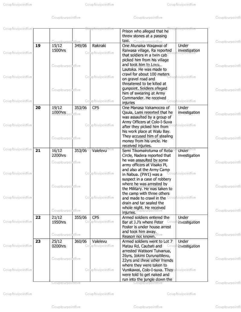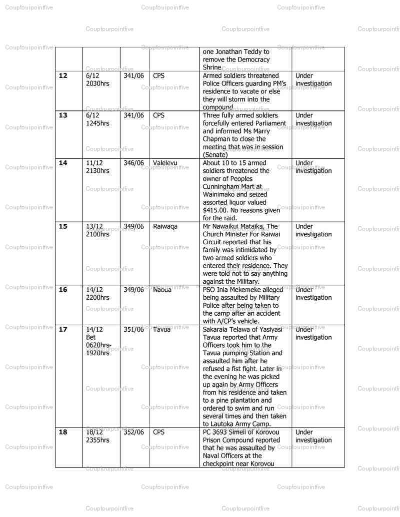 Some of the soldiers who acted against the people of Fiji in the 2006 coup have already been named. Others haven't and can now be revealed in the following document - a compilation of complaints at CID headquarters - before Jim Koroi was appointed Police Commissioner and put a stop to all investigations. The procedural document - aimed at ascertaining "what laws were being broken" by the army in the takeover - will (along with many others) ensure the complaints can be revisited and the offenders brought to justice.