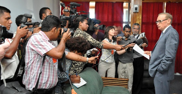 | Bob Carr addressing the media in Fiji upon arrival yesterday. Photo: Minfo |